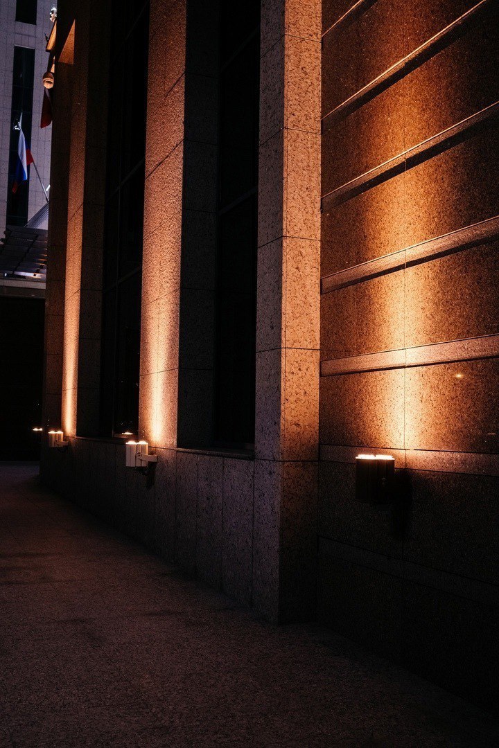 Для фасадной подсветки были использованы прожекторы L-lego II, часть из которых выкрашена в янтарный цвет, чтобы гармонировать с фасадом. Кроме того, в светильниках установлены янтарные светодиоды, создающие контрастное освещение.